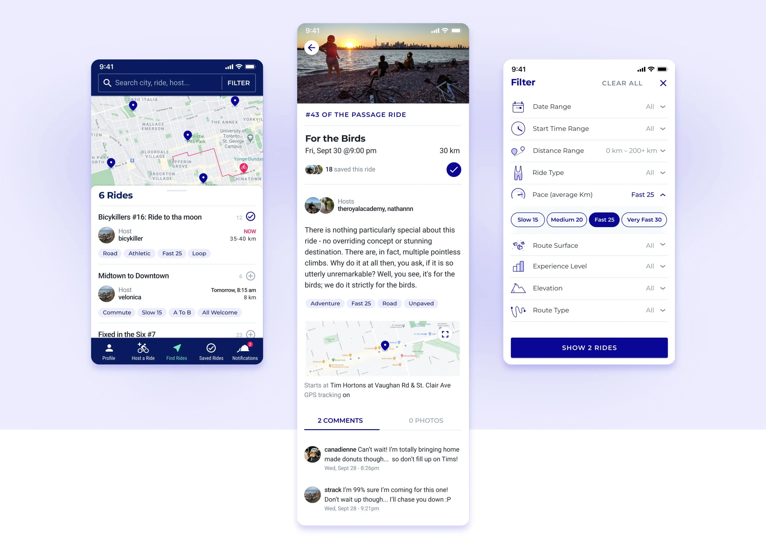 New riders expressed the need of encouragement tags such as “all welcome” if they were to consider showing up to an unknown group ride. Several participants also noted the inconsistent language between “saved rides” and “RSVPing” and the use of a heart icon to save rides proved to be confusing. “How can I like I ride I haven’t been on yet?” was one comment I received. The test group also preferred something closer to Facebook’s “interested in this event” over RSVPing, as it felt too committal, especially for newer riders.